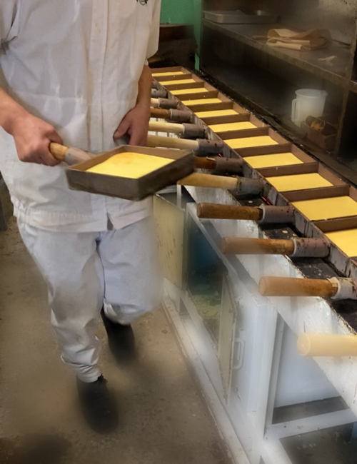 伊達巻の製造現場、職人が朝から伊達巻を手作りで焼き続けます!
