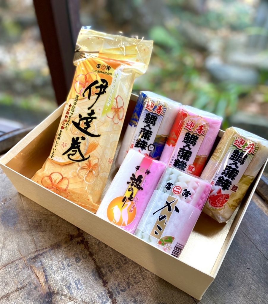 迎春商品には、左から伊達巻、上段の迎春鯛入り蒲鉾白、迎春鯛入り蒲鉾紅、迎春鯛入り蒲鉾焼、下段左から紅白2色かまぼこの鴻のとり、3色彩りかのこ